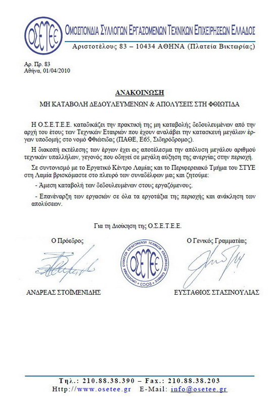 ΑΝΑΚΟΙΝΩΣΗ ΟΣΕΤΕΕ ΓΙΑ ΦΘΙΩΤΙΔΑ (01/04/10)