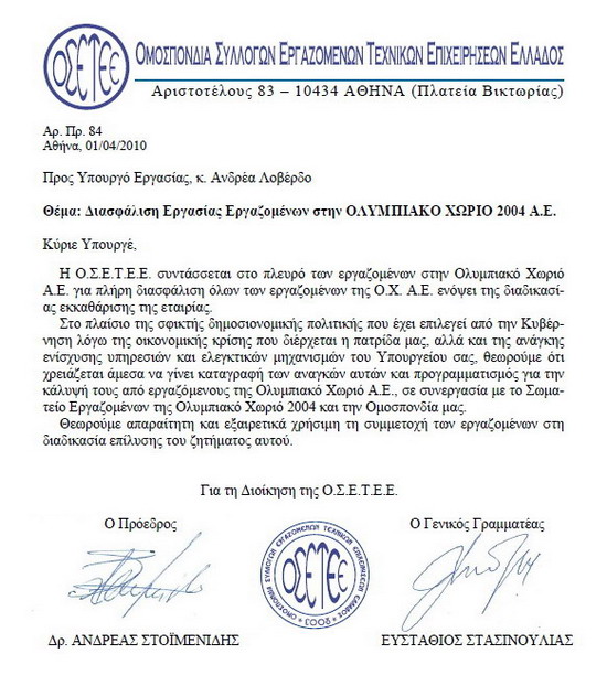 ΑΝΑΚΟΙΝΩΣΗ ΟΣΕΤΕΕ ΓΙΑ ΟΧΑΕ (01/04/10)