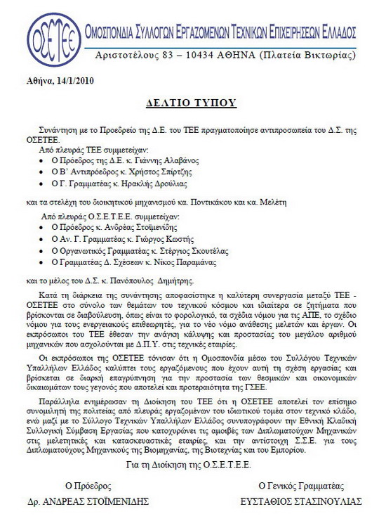 ΣΥΝΑΝΤΗΣΗ ΜΕ ΤΟ ΠΡΟΕΔΡΕΙΟ ΤΗΣ Δ.Ε ΤΟΥ ΤΕΕ (14/01/10)