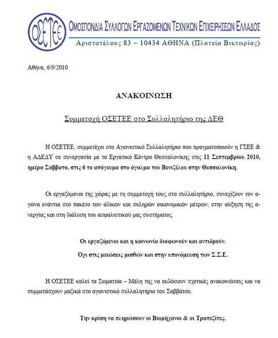 Απόφαση- Κάλεσμα ΟΣΕΤΕΕ για συμμετοχή στην απεργία στις 26/09/12