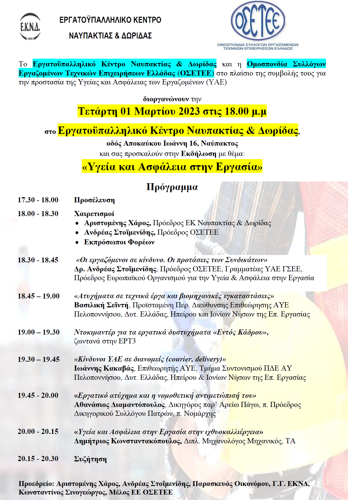 Εκδήλωση για την Υγεία και Ασφάλεια στην Εργασία στην Ναύπακτο την Τετάρτη 01/03
