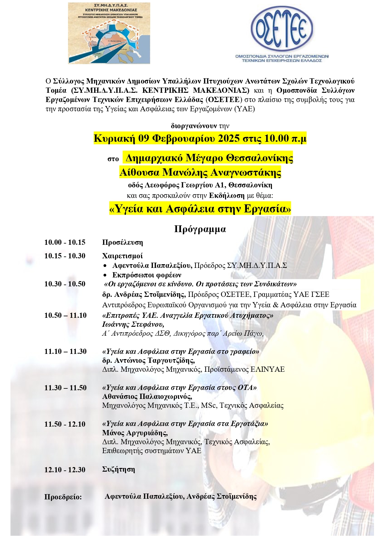 Εκδήλωση για την Υγεία και Ασφάλεια στην Εργασία στην Θεσσαλονίκη την Κυριακή 09 Φεβρουαρίου 2025